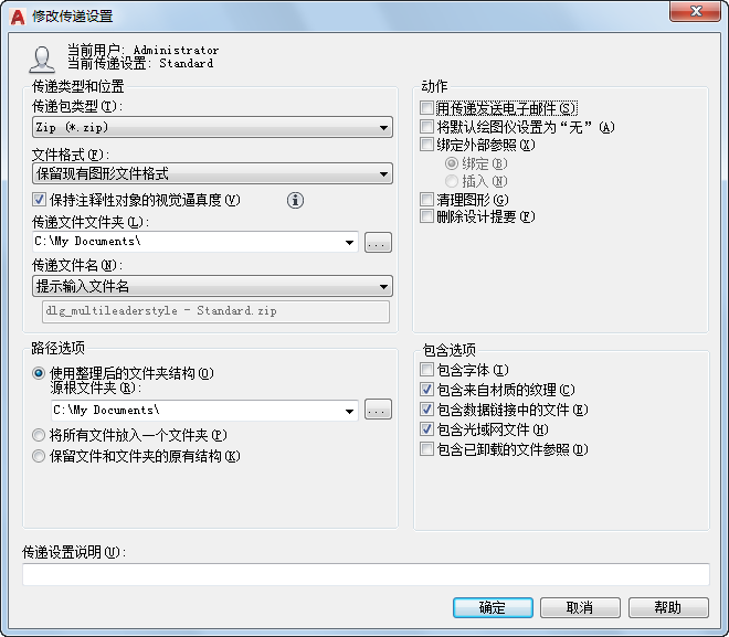 输入传递设置的说明。此说明显示在“创建传递”对话框的传递文件设置列表下。用户可以选择列表中的任何传递设置以显示其说明。