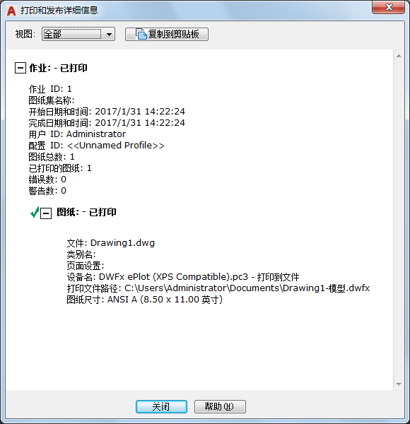 显示关于所有完成的打印和发布作业以及这些作业中的图纸的信息。