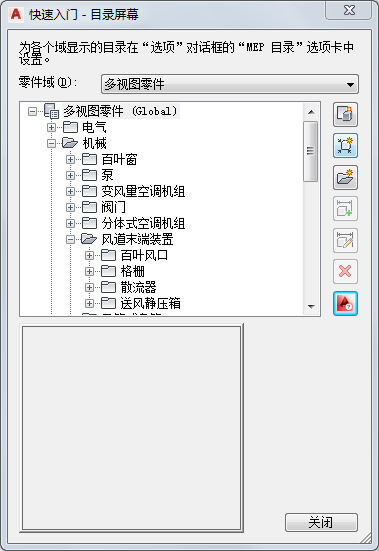 启动构件编辑器时,将显示“快速入门 - 目录屏幕”对话框。该任务特定的对话框可充当一个开关,能使您快速访问不同的工作环境。“快速入门 - 目录屏幕”对话框包含一个零件目录浏览器和一个图标栏。从“选项”对话框中的“MEP 目录”选项卡上指定的已加载零件目录列表中选择一个目录。若要了解有关零件目录以及如何在目录中存储零件的详细信息,请参见“零件目录的基本内容”。