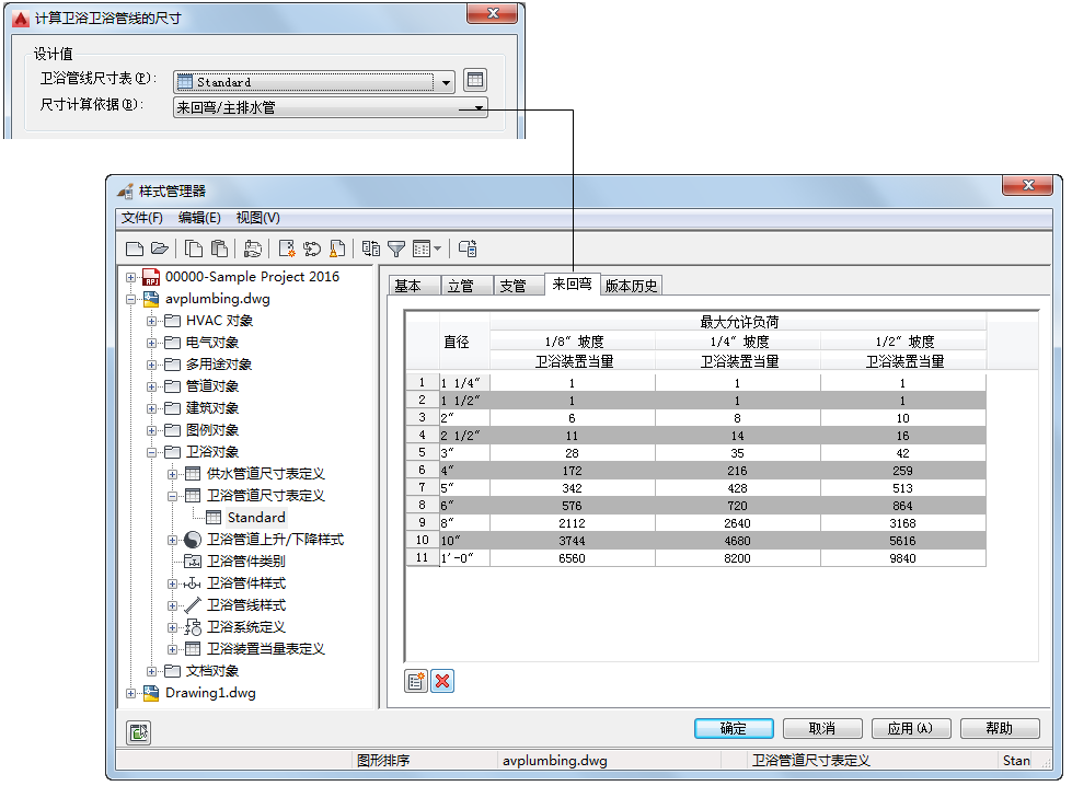 大多数卫浴系统都可以在包含多个楼层的建筑中找到。建筑中的每个楼层通常都绘制在单独的一张图形上。如果计算尺寸的卫浴系统穿越多个楼层,必须从最高楼层开始向下分别计算各个图形的卫浴管线尺寸。然后在计算较低楼层上的卫浴管线尺寸时,可以参照较高楼层中的各个计算值。有关详细信息,请参见“计算多个楼层卫浴管线尺寸的步骤”。