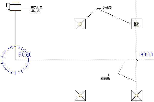 简单单线系统的俯视图:变风量空调末端连接到 4 个散流器。