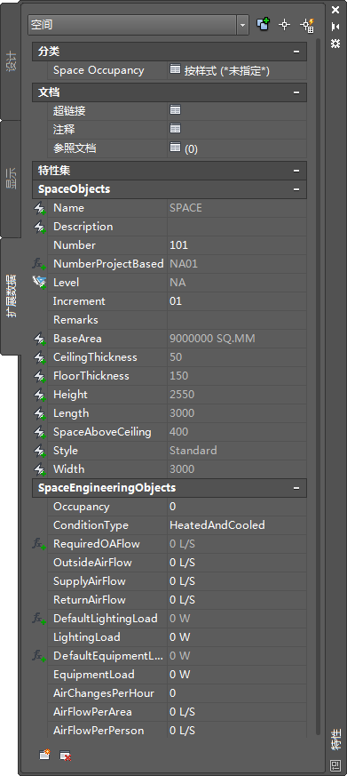 为了进行负荷计算,必须向要分析的所有空间添加 SpaceEngineeringObjects、ThermalProperties 和 ZoneEngineeringObjects 样式特性集。使用以下过程可向空间添加工程数据。