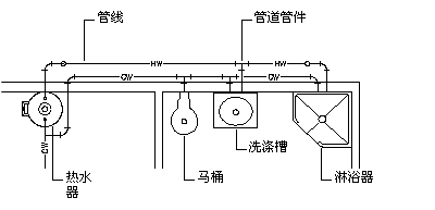 在图形中添加设备和装置后,便可以创建管道管路。管道管路是一组卫浴管线,由将气体或液体从一点运送到另一点的单独绘制的管段组成。网络是系统内一组互联的管道管路,如将污水从连接的马桶、洗涤槽和淋浴器排到主排水线的管路。