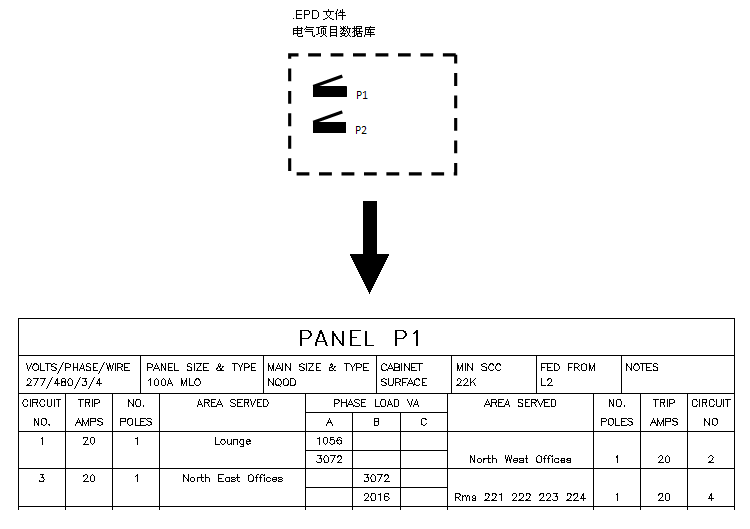 对于施工图,可以使用电气项目数据库创建配电盘明细表。此外,回路数据直接源自电气项目数据库。