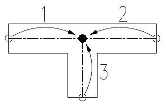 T 形三通有 3 个修剪长度:两个是从主风管的中心点到主风管刚架柱的每个端点(1 和 2)来定义的,第三个则是从主风管的中心点到支管刚架柱的端点 (3) 来定义的。