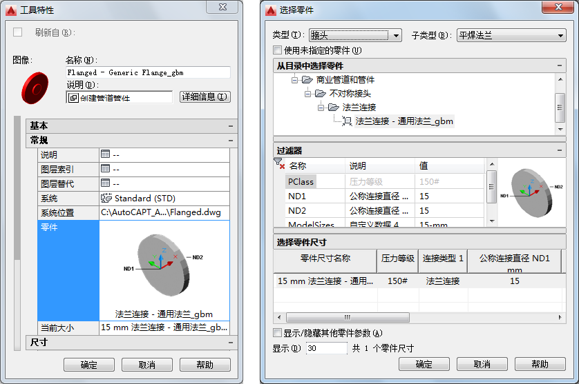 提示: 选择“使用未指定的零件”类型,以禁止在此对话框中选择零件。选择此选项后,将在工具选项板上创建一个不包括指定特性的工具。在布局管道管路时,可以使用此新工具启动对象的“添加管件”命令。