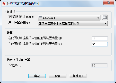 如果该尺寸是根据立管计算所得,“计算卫浴管线的尺寸”对话框显示的是图形中立管的尺寸结果。