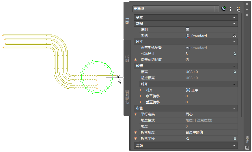 “特性”选项板为配置平行折弯提供了两个选项:“同心”和“固定半径”。通过这两个选项可以指定在平行套管管路中使用的弯头半径的类型。