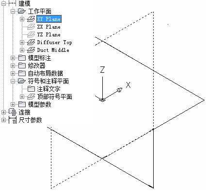 使用以下过程可添加在其上创建模型的几何图形的工作平面。为了避免混乱,除非您使用偏移工作平面或参照工作平面,否则请在工作时仅保持一个工作平面可见。需要其他工作平面来构建模型时,可创建它们。这对于使用偏移工作平面定位零件的多个侧面(如风道末端装置的两个面)很有帮助。使用参照工作平面定位零件上的几何图形(如接线盒的敲孔或水箱上的接头)很有帮助。
