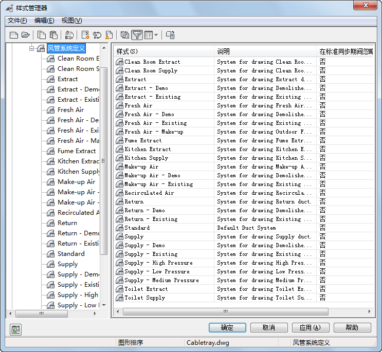 在设计布局过程中可以根据需要创建系统。但是,建议在项目开始时定义一系列系统,并在项目的使用过程中对其进行维护。AutoCAD MEP 根据常用行业标准提供了一组预定义系统。每个系统都有默认定义,包括系统缩写、图层索引和显示特性。