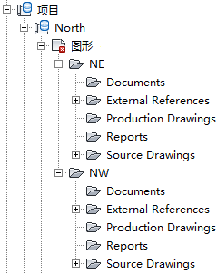如图 2 中所示,项目 NE 和 NW 位于名为 North 的单个 Vault 项目内。 Vault 参照可以连接到 North 项目文件夹中的任何对象。 如果您需要将这些参照扩展到其他项目,请在 North 项目工作文件夹中为这些项目创建新的文件夹。 使用 Autodesk Vault 管理工具在 Vault 中复制项目结构。 您可以使用项目中的子文件夹对图形和文档的文件夹进行组织,但不能对其他项目对象(例如“浏览”中的参照连接或 Vault 数据库文件 [PointsStatus.mdb、PointsGeometry.mdb、Survey.sdb 和 Survey.sdx ])进行组织。