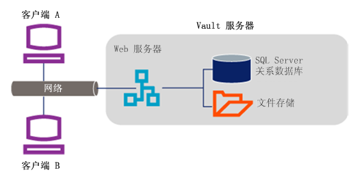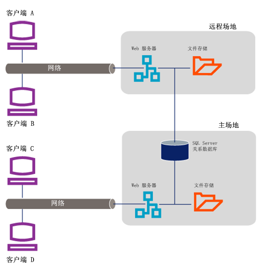 如图 6 中所示,多场地 Vault 安装使用 SQL Server 单个实例为两个或更多个场地管理文件。每个数据库(也称为“Vault”)通常会在每个场地处进行复制以方便文件共享,但不是所有文件都会被复制。根据需要将各个文件分发给用户。SQL Server 将保持追踪文件副本的存储位置并确保这些副本已更新或用户已收到有关更改的通知。可以从任意位置管理整个网络的数据库管理任务。