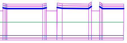 下图显示了在 AutoCAD Civil 3D 中使用此部件创建的道路的一部分。深蓝色线表示偏移目标。在未找到偏移目标的情况下,不会应用部件的“路缘和边沟”部分。