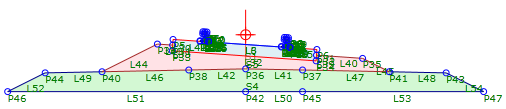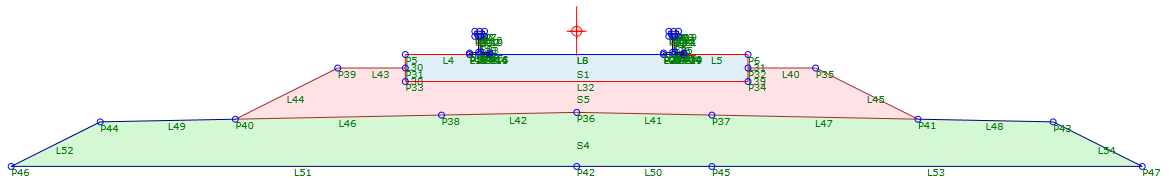 为确保在 Autodesk Subassembly Composer中使用部件时正确计算铁路超高,以及在 Subassembly Composer 中正确预览铁路超高,请确保“预览”面板中显示的原点(由 指示)位于左侧轨道顶点与右侧轨道顶点之间的中心点处,如下图所示: