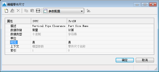 将显示“编辑零件尺寸”对话框,显示选定零件的所有当前可用的尺寸参数。对于简单圆柱形结构零件示例,某些默认尺寸参数为“零件尺寸名称”(PrtSN) 和“结构垂直管道净空”(SVPC)。