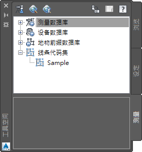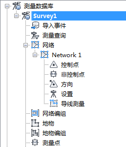此选项卡显示了在测量项目数据库、设备数据库及地物前缀数据库中组织的测量项目数据。项目数据库用于记录测量点、网络及地物。设备数据库用于记录各个测量设备的标准偏差和其他可操作参数。地物前缀数据库用于记录从测量点创建地块、建筑或其他地物时应用的转换例程。