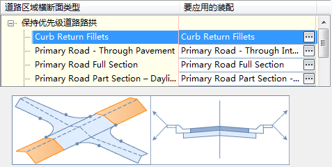 对话框上的概念图:每当您在交点编辑对话框中选择特性或项目进行编辑时,显示在编辑对话框底部的概念图都会更新以指示交点处受编辑影响的位置。