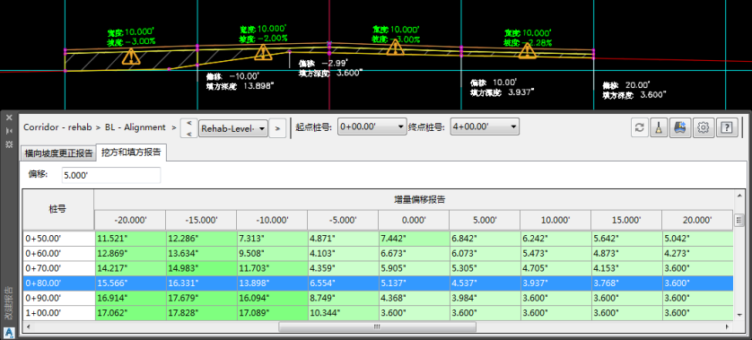 You can use the Rehab Manager to generate Cross Slope Correction and Milling and Leveling reports for selected stations within rehab corridor regions. You can make changes to values in the reports, and apply the changes back to the rehab corridor. For more information, see To Generate Rehab Corridor Reports.