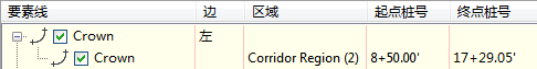 在下例中,“提取道路要素线”对话框中所示的要素线桩号标注从桩号 8+50 开始。 沿道路区域基准线测量此桩号。