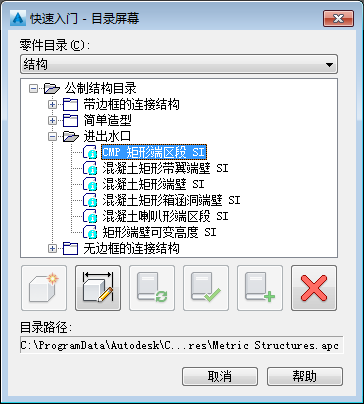 ”对话框中,您可以选择使用管道目录或结构目录并浏览此目录中的类别。使用此对话框上的图标,您可以执行多个任务。如果将鼠标放置在图标上,工具提示将提供对该图标的解释。将根据在目录树中选定的内容激活图标。
