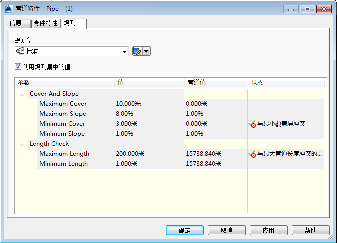 下图是图形中某一管道上“规则”选项卡的示例。在此示例中,此管道的“最小覆土厚度”和“最大长度”特性将与“管道值”列中说明性的违反规则文本 一同显示,因为其违反了“”列中指定的设计规范。请注意“状态”列中显示的违反规则说明性文本;例如“已超出最小管道覆土厚度”和“超出最大管道长度的值”。