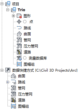该图显示了名为 Trio 的 Vault 项目的集合和名为 Arc 的数据快捷方式项目的集合。这两种项目类型均是从默认项目模板创建的。因此,它们具有相同的曲面集合、路线集合和可以在多个图形中参考的其他对象的集合。