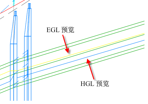 下图显示了预览中 HGL(水力坡降线)和 EGL(能量坡面线)管线的详情。