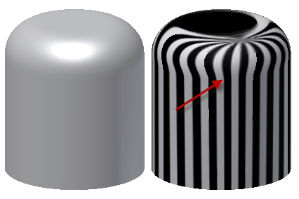 斑纹分析也称为平滑度分析,通过将平行线投影到模型上来检查曲面的连续性。结果显示光线是如何在曲面上反射的,以帮助用户识别需要改进曲面质量的区域。
