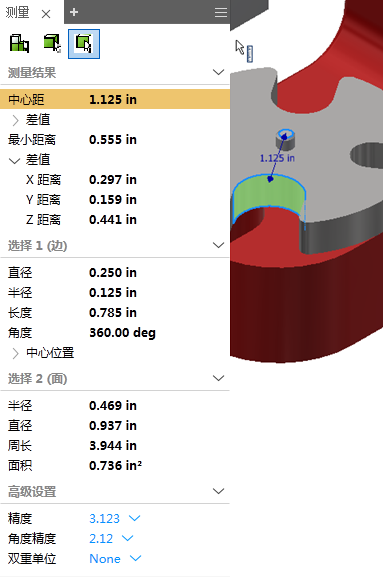 有关每个选定对象的信息显示在测量工具面板和图形窗口中。测量工具面板显示了选定对象的所有可能的值,以及选定对象的结果。在“测量”工具面板中单击值可在图形窗口中显示选择和测量。
