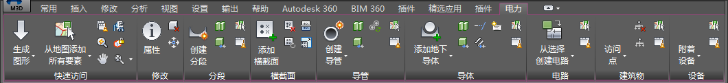 The Electric ribbon tab provides access to the most common operations in AutoCAD Map 3D Electric. For example, you can create a segment using the Segment panel, add a Cross Section using the Cross Section panel, and then add ducts and conductors using the Duct and Conductor panels. Use the Circuit panel to define circuits by selecting the feature or by performing a trace. Use the Structure and Device panels to add structures and devices. The features you create using the Electric ribbon tab are displayed in the appropriate containers in the Electric Explorer. See Electric Explorer.