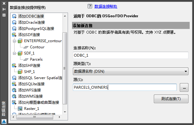 在“数据连接”窗口中指定新连接。不要将 ODBC 源中的任何特定要素类图层添加至地图。连接到 ODBC 源时,所有信息将自动可用于 AutoCAD Map 3D。
