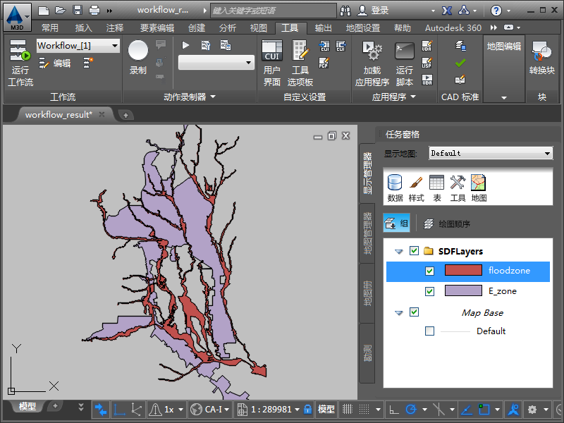 运行工作流时,AutoCAD Map 3D 会列出指定文件夹中的 SDF 文件。然后,将创建“显示管理器”组以容纳所创建的图层。它将连接到指定文件夹中的 SDF 文件。对于指定文件夹中的每个图形,该程序都会执行连接,将图层添加到“显示管理器”中并将图层移至新组。