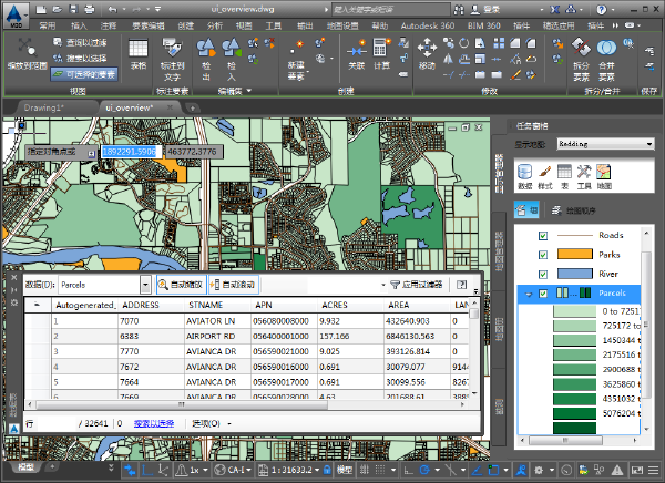此地图具有用于铁路、公路、公园、河流和地块的显示管理器图层。每一个图层的样式都不同。有关 AutoCAD Map 3D 窗口各部分的简介,请参见第 2 课:快速浏览 AutoCAD Map 3D。