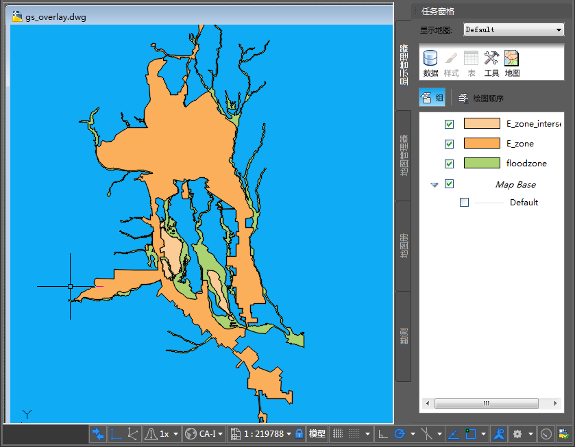 此地图覆盖两个图层(洪水淹没区和企业区)。可以使用覆盖查看两个图层的交集。交集区域成为新图层,可为其设置样式并保存至文件,还可以将其用作单独的数据存储。