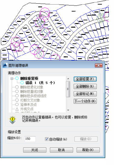 使用图形清理工具,可以自动更正常见绘图和数字化错误。删除重复对象、更正未及点和悬挂对象等。