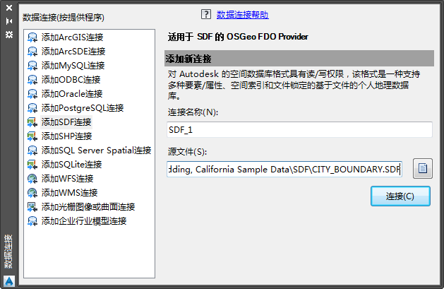 选择 SDF 提供程序并导航至样例文件 CITY_BOUNDARY.SDF。