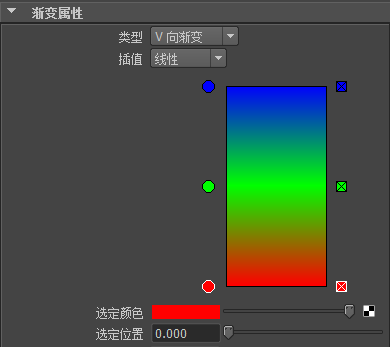 - 在“属性编辑器”(Attribute Editor)的“渐变属性”(Ramp Attributes)部分,选择位于颜色渐变左上方的蓝色小圆形。“选定颜色”(Selected Color)旁边的彩色框会改变。