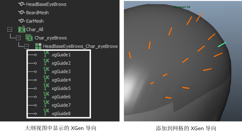 您可以使用 XGen 导向放置、定形和定向在多边形网格上生成的基本体。将导向作为基本体的代理版本,确定基本体生成的位置和显示方式。可以指定在创建新描述时要使用导向。生成可修饰样条线时,无法使用导向。请参见使用样条线基本体创建头发或毛发