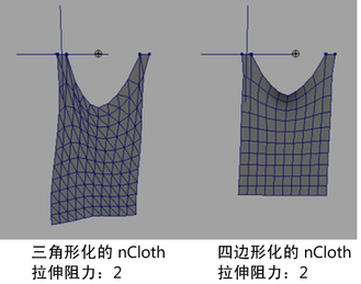 使用三角化的网格创建 nCloth 时,模拟期间可能会发生拉伸阻力区域和方向上的偏移。在下面的 nCloth 示例中,三角化的 nCloth 在“变换”(Transform)约束区域出现拉伸偏移。在四边形 nCloth 网格中,交叉链接将使得拉伸更均匀。