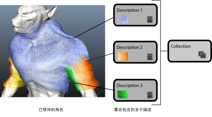 XGen 描述存储用于定位、生成和渲染基本体的设置。每个描述控制网格曲面的选定面上的基本体(称为 XGen 面片)。您可以向多边形网格添加任意数量的描述。描述包含在集合中,且在集合之内加以组织。