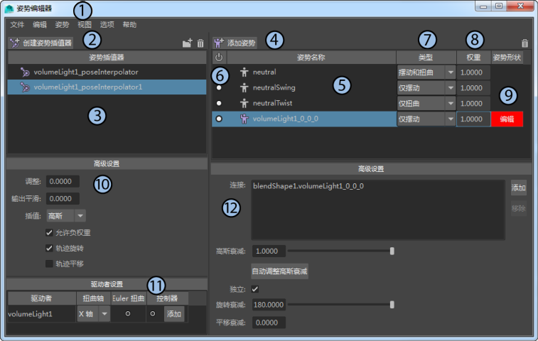 用于编辑选定姿势插值器的关节。当您选择(View > Advanced)时,或者在姿势插值器节点名称上单击鼠标右键并选择“显示驱动者设置”(Show Driver Settings)时,将显示此面板。有关详细信息,请参见下文。 |