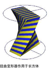 扭曲变形器允许围绕轴扭曲任何可变形对象。它们对于角色的设置和建模十分有用。扭曲变形器包括控制柄,支持以直观方式控制扭曲效果的范围和次数。