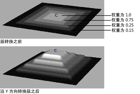 通过使用“绘制簇权重工具”(Paint Cluster Weights Tool)在簇的曲面上进行绘制,可以简单地设定簇权重。虽然可以首先变换簇,然后在曲面上绘制权重,由于“绘制簇权重工具”(Paint Cluster Weights Tool)提供颜色反馈,所以您可在变换簇之前知道簇的哪些部位具有不同的权重。权重显示为一系列的灰度值,灰度值为 1 和 0 时,权重分别显示为白色和黑色。请参见绘制簇权重工具。