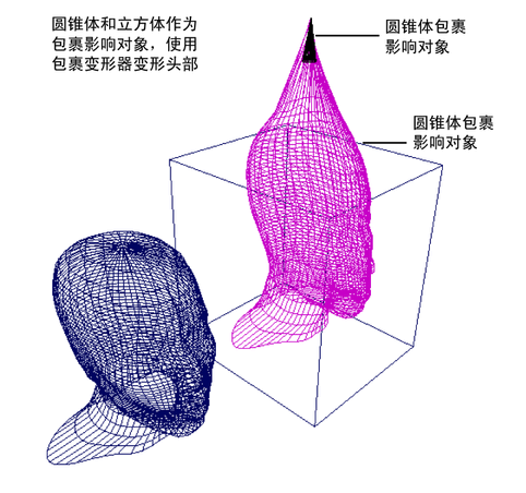可以影响一个或多个具有相同的包裹影响对象的可变形对象。创建包裹变形器时,Maya 将为每个可变形对象创建包裹变形器节点。