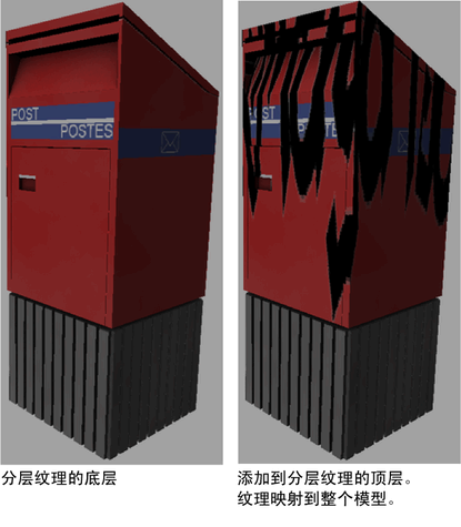 可以在硬件渲染器中显示分层纹理并为每个不同的纹理创建多个 UV 集。这样可以根据需要在场景中定位纹理。
