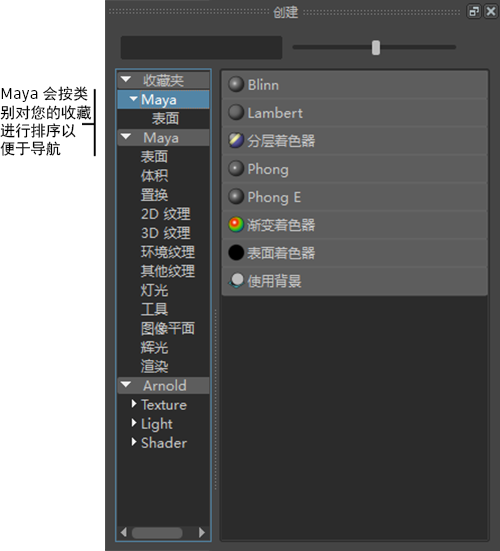 “创建”(Create)选项卡相同的功能。在“Hypershade”中创建的任何“收藏夹”(Favorites)列表,也可以显示在另外两个窗口中,反之亦然。