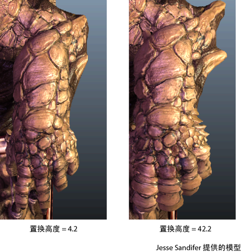 如果对灰度置换贴图使用 .exr 文件,不需要调整“置换偏移”(Displacement Offset)或“置换高度”(Displacement Height)值,会自动使用默认设置。如果对切线向量置换贴图使用 .exr 文件,应将 Displacement Offset 设置为 0 并将 Displacement Height 设置为 1。