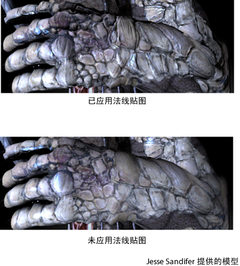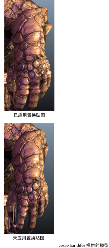 置换贴图优于法线贴图之处在于:阴影可以拾取置换贴图的新细节。