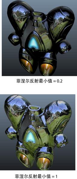 使用 Reflection Fresnel Min 可将更多反射添加到对象的面(与摄影机垂直)。