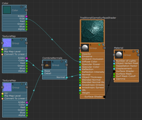 将基准法线作为“纹理贴图”(Texture Map)连接到“合并法线贴图”(Combine Normal Maps)的“基础”(Base)属性,将详细的法线贴图作为“纹理贴图”(Texture Map)连接到“详细信息”(Detail)属性,然后将“合并法线贴图”(Combine Normal Maps)的“法线”(Normal)属性连接到“TraditionalGameSurfaceShader”的“法线”(Normal)属性。